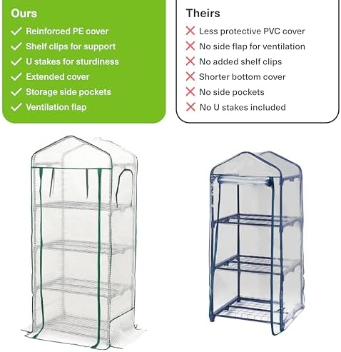 Aukščiausios klasės sodo šiltnamis su keturiais lygiais, plieniniu rėmu ir sustiprinta PVC danga. Matmenys 160 x 69 x 49 cm, stabilus ir lengvai surenkamas. Puikiai tinka balkonams ar terasoms. Kiekvienas lygis leidžia auginti skirtingas rūšis. PVC danga apsaugo nuo lietaus ir vėjo. Plienas nerūdija net drėgnoje aplinkoje. Greitas montavimas be specialių įrankių. Erdvus vidus talpina daug vazonų. Patvarumas užtikrina ilgą tarnavimo laiką.