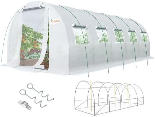 KING BIRD lauko šiltnamis su cinkuotu plieno rėmu. Matmenys 6,5 x 3,5 x 1,8 m, įėjimas iš abiejų pusių. Tinklelio durys ir PE durys. Sustiprinta 140 g/m² danga su UV apsauga. Žemės kaiščiai ir lynai stabilumui. Žalia arba balta spalva. 100% atsparus vandeniui. Durys didina ventiliaciją. Ilgaamžis net stipriame vėjyje. Erdvus vidus talpina daug augalų.