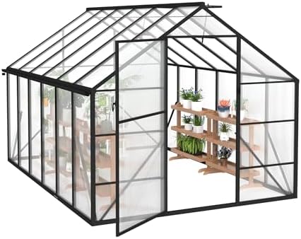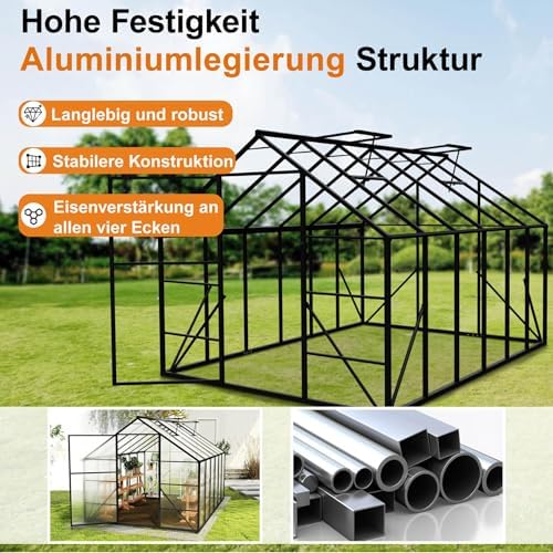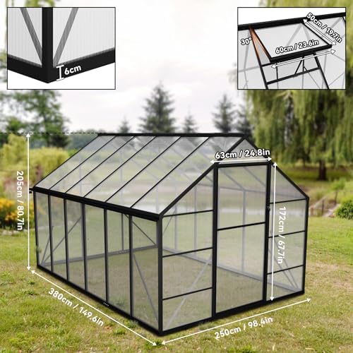 Premium aliuminio šiltnamis 380 x 250 x 205 cm, plotas 9,5 m². Sustiprintas pagrindas ir stogo langas. Atsparus oro sąlygoms ir temperatūrai. 4 mm polikarbonato plokštės. Aliuminio lydinio rėmas. Žemės inkarai stabilumui. Puikiai tinka pomidorams ir daržovėms. Durys ir langas ventiliacijai. Plotas leidžia vaikščioti viduje. Ilgaamžis nuo -25 iki +60 °C.